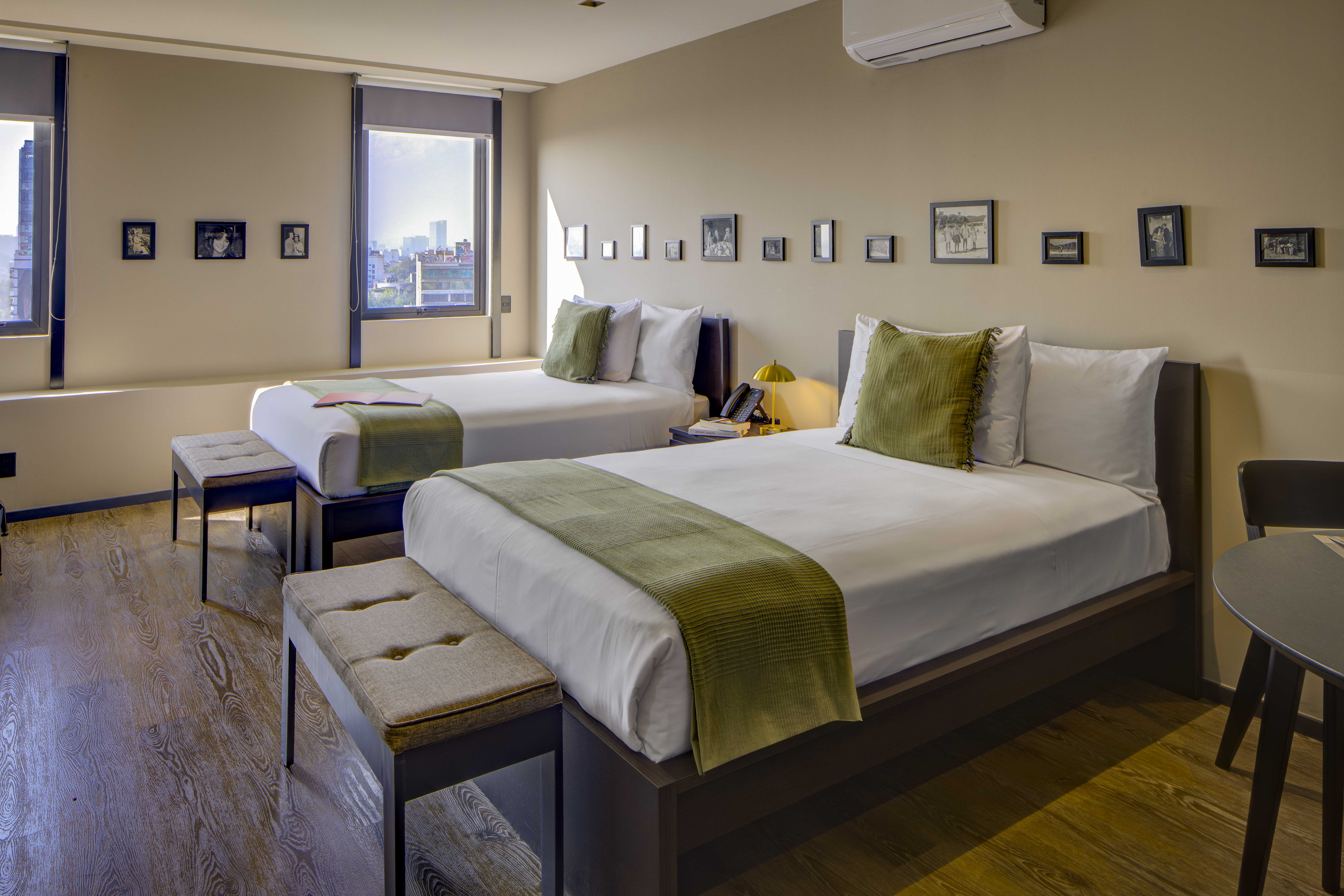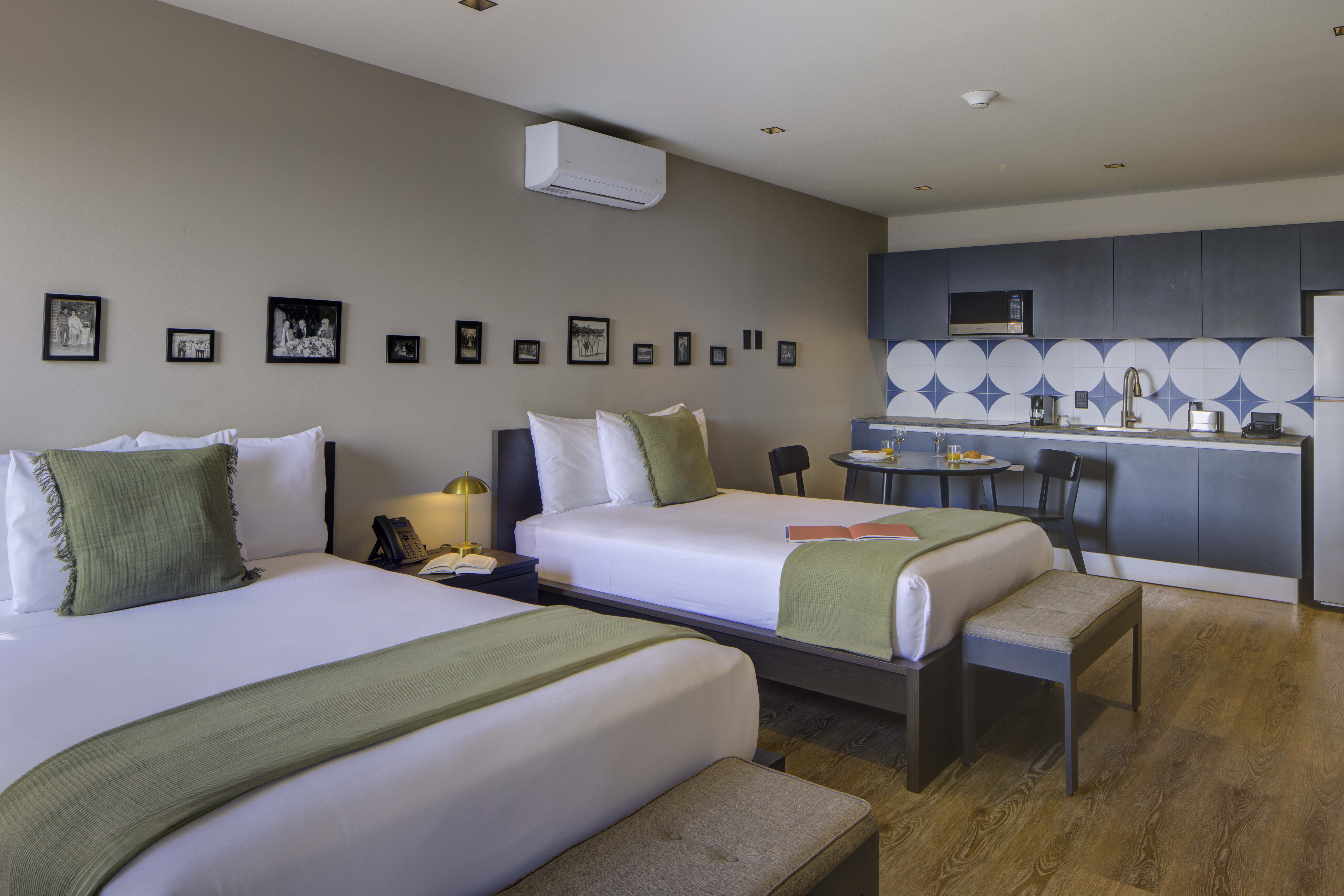 Perfecta para familias o amigos, nuestra Standard Double Suite en Roma Norte te ofrece dos camas dobles pillowtop y un baño moderno con ducha tipo lluvia y amenities premium. El área social tiene comedor y kitchenette con refri y microondas, ideal para quienes buscan un hotel con cocina en CDMX. Disfruta de Smart TV 65”, WiFi gratuito, cortinas blackout, caja fuerte, Nespresso, plancha y tabla. ¡Comodidad y tecnología en un solo lugar!